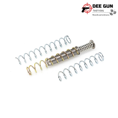 This system works due to the multi spring intricate rod (3 springs) and controls the functionality of the gun. The third spring which is contained within the rod controls the movement of the slide so it never rams on the frame. Also 3 separate external springs are included with the system. The springs are different in length with the longest being heaviest when the slide is on the battery, so the shooter can fine-tune the weapon for his/hers personal standards.